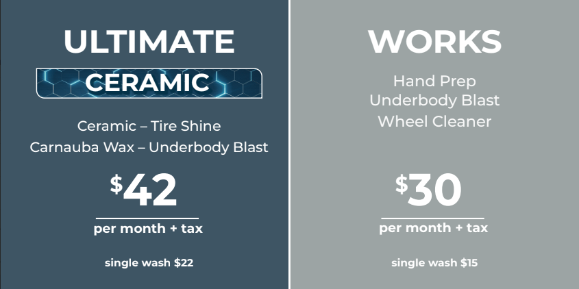 If you are on the Ultimate Wash plan, please click the link below to choose if you'd like to move to the Works Wash plan or the "new" Ultimate Wash plan with Ceramic Protection and Tire Shine.